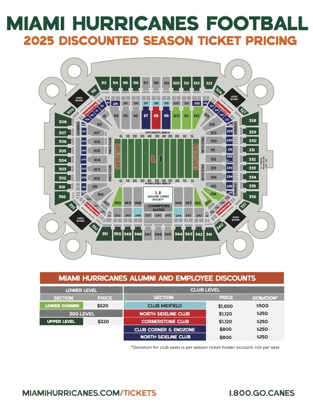 University of Miami alumni are eligible for preferred ticket pricing on up to four Hurricanes Football and/or Hurricanes Basketball season tickets. Take a look at the exclusive alumni pricing below. Hard Rock Stadium is filling up! Want help selecting your seats? Contact the Hurricanes Ticket Office to speak with a dedicated Account Executive at 1-800-GO-CANES or email hurricanestickets@miami.edu . We want to ensure you are there with us for the start of another historic Hurricanes Football season.